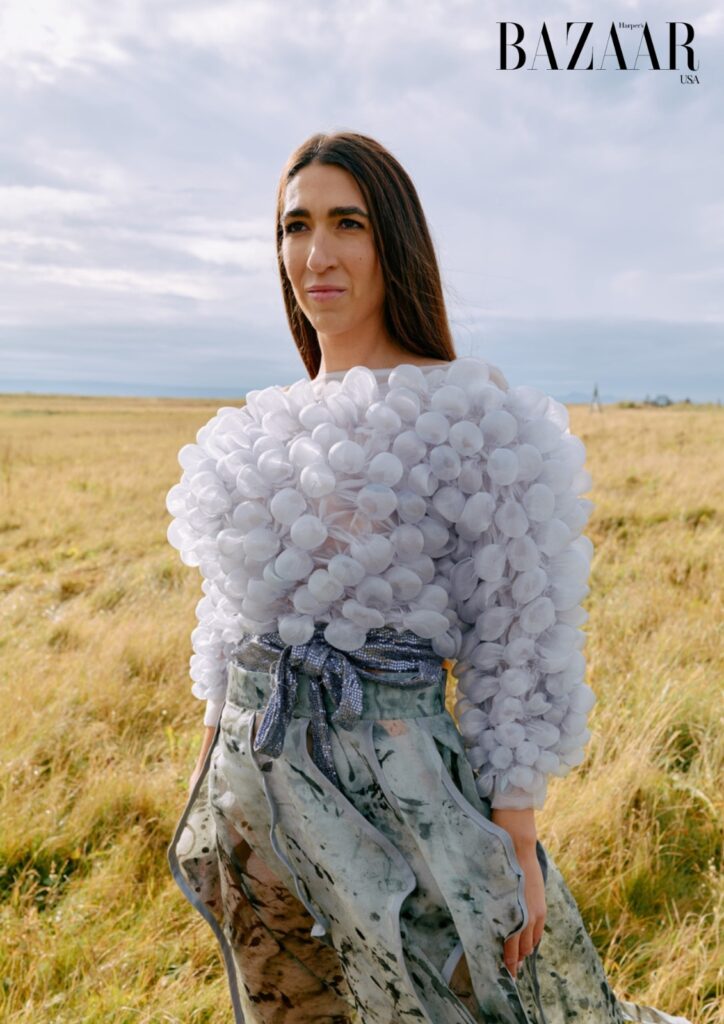 Today, Riebschlager’s brand DoviArt Fashion is known for something you don’t see much anymore—true originality. Her sculptural “bubble” designs stop people mid-scroll. Her zerowaste practices challenge an industry drowning in excess. And her made-to-measure pieces fit clients she’s never even met in person.
